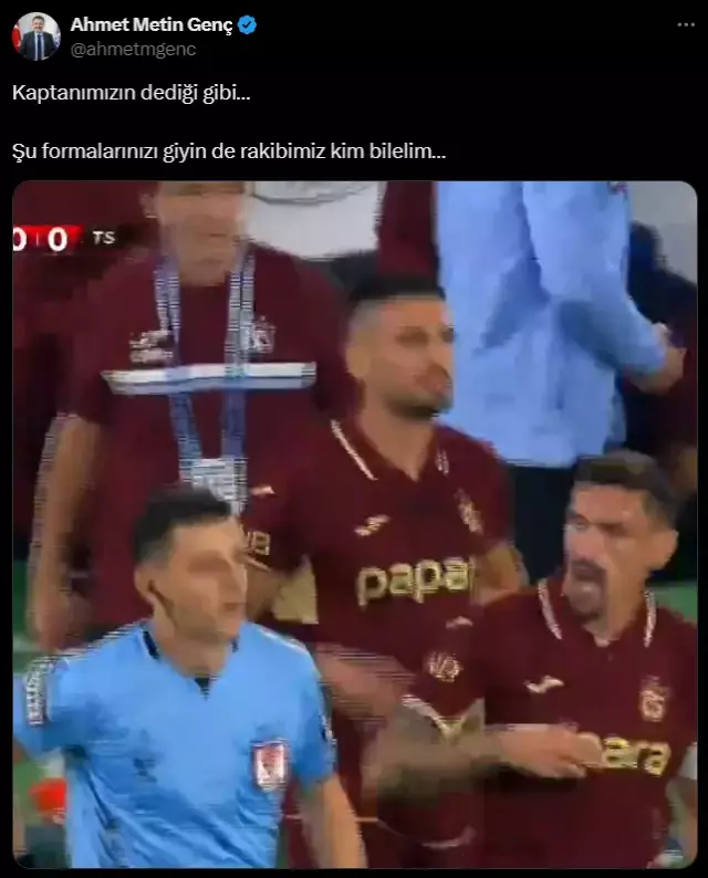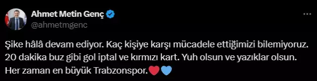 Maçın akabinde Trabzon Büyükşehir Belediye Başkanı Ahmet Metin Genç, müsabakadaki hakem kararlarıyla ilgili yaptığı paylaşımda “Şike hâlâ devam ediyor. Kaç bireye karşı uğraş ettiğimizi bilemiyoruz. 20 dakika buz üzere gol iptal ve kırmızı kart. Yuh olsun ve yazıklar olsun. Her vakit en büyük Trabzonspor” tabirlerini kullandı.